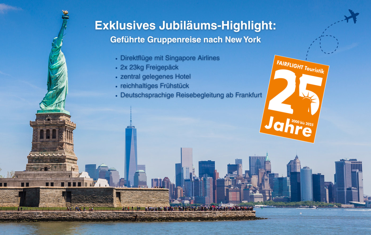 Stellen Sie sich vor: Sie landen in der Metropole, die niemals schläft. In nur 6 Tagen tauchen Sie tief ein in das pulsierende Herz von Manhattan, erleben atemberaubende Skyline-Blicke, spannende Ausflüge und bewegende Erinnerungen. Die Gruppenreise „Traumziel New York“ von FAIRFLIGHT macht es möglich – stressfrei, komfortabel und voller Highlights.
