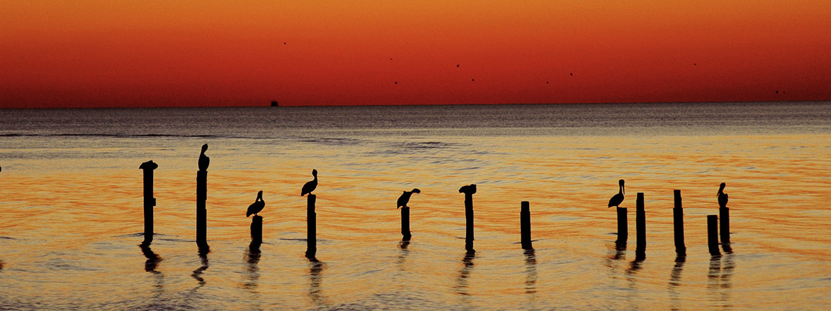 Pelikane vor dem Sonnenuntergang an der Golfküste in Biloxi | provided by MISSISSIPPI