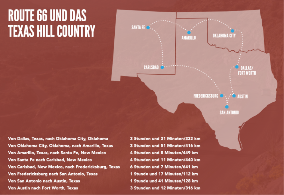 Pack deine Koffer, dreh den Sound auf und lass dich von der Route 66 und dem Texas Hill Country inspirieren!🌵 Den vollständigen Reiseverlauf mit allen Etappen, Tipps und Kartenmaterial kannst du hier bequem herunterladen. Weitere Informationen und Inspiration für Reisen in die USA finden sich unter AmericaTheBeautiful.com.