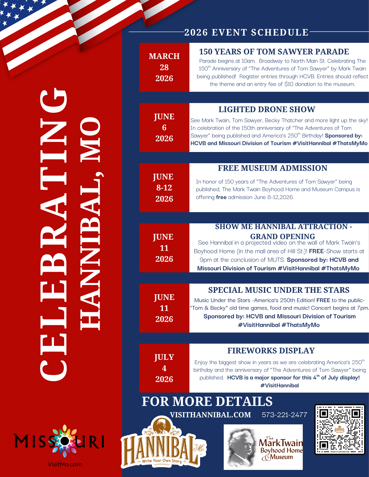 2026 ist für Hannibal ein besonderes Jubiläumsjahr: Die Stadt feiert sowohl das 250-jährige Bestehen der USA als auch den 150. Jahrestag der Veröffentlichung von The Adventures of Tom Sawyer von Mark Twain. Das Mark Twain Boyhood Home & Museum gewährt daher vom 8. bis 12. Juni 2026 freien Eintritt. In diesem Zeitraum werden 1.000 kostenfreie Exemplare von „Die Abenteuer des Tom Sawyer“ an Besucher verteilt. Geplant sind zahlreiche Veranstaltungen, darunter eine große Parade, eine Drohnenshow, ein Konzert, eine Vortragsreihe sowie ein besonders großes Feuerwerk am 4. Juli.
