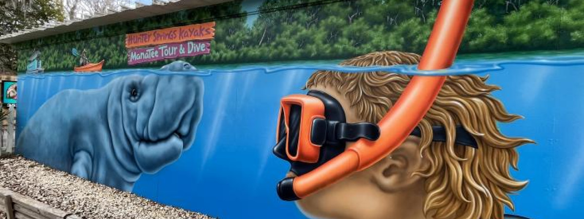 Ein lebendiger und bunter Laden, Hunter Springs Kayaks, beherbergt mehrere wunderschöne Murals. Von den niedlichen, versteckten Otterfreunden und  einer Karte des weltberühmten Kings Bay bis hin zum neuen Kunstwerk, einer großen Darstellung eines Schnorchlers, auf Tuchfühlung mit einer Seekuh.