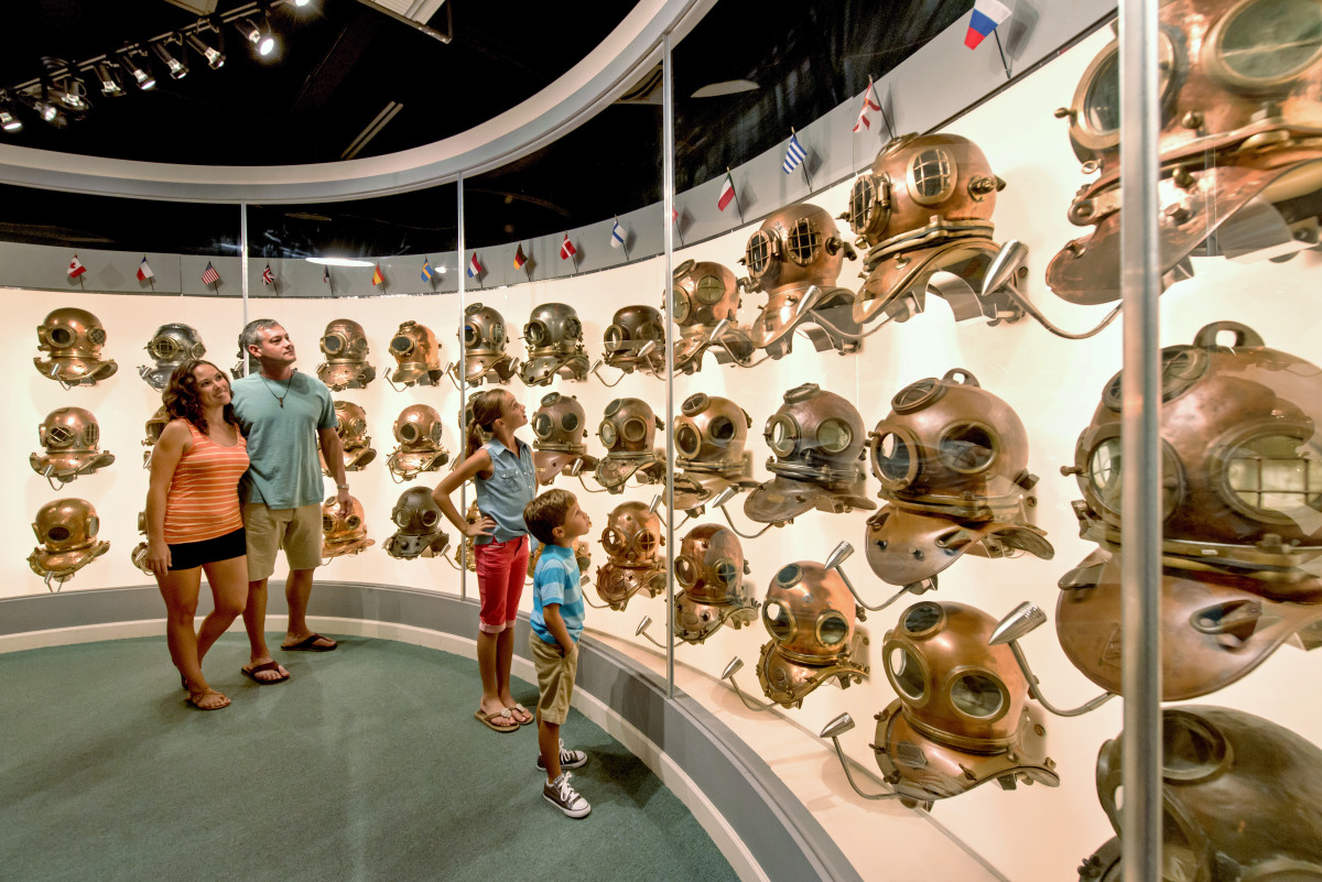 Visitors explore an impressive collection of historic diving helmets at the History of Diving Museum in The Florida Keys.