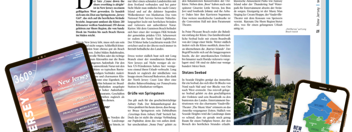 Erfahrt mehr über die sieben verschiedenen Regionen von New Jersey und was sie an touristischen Highlights zu bieten haben. 210 Kilometer Atlantikküste sind immer ein gutes Argument für eine Reise nach New Jersey, aber auch Princeton, Asbury Park oder Jersey City sind einen Besuch wert. Entdeckt die Spielerstadt Atlantic City und was sie alles zu bieten hat. Begebt euch auf eine kulinarische Reise und entdeckt die Weingüter des Staates oder speist in einem der vielen Diner, entdeckt die Doo Woo Kultur im legendären Wildwood oder fahrt mit der Seilbahn entlang des Strandes in Seaside Heights.