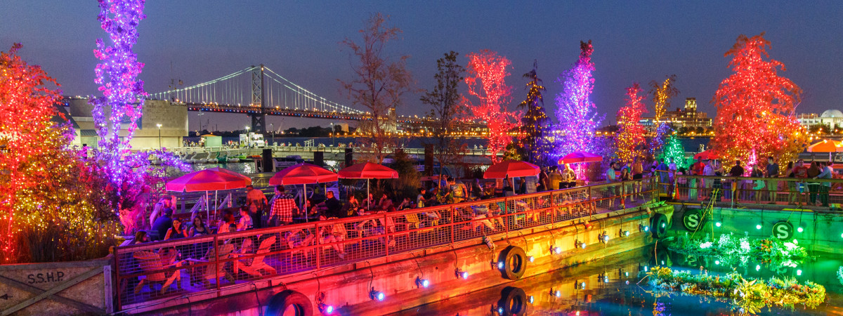 Neben sogenannten Pop-Up-Events an allen möglichen Orten in der Stadt, ist Philadelphia bekannt für Pop-Up-Parks, die während der Sommerzeit wie aus dem Nichts entstehen und Groß & Klein begeistern. Spruce Street Harbor Park_Credit Matt Stanley Dazu zählt zum Beispiel der Spruce Street Harbor Park direkt an der Uferpromenade des Delaware River. Hier gibt es von Mai bis September schwimmende Gärten, Lounges und zahlreiche Hängematten, die sich perfekt zum Entspannen eignen. Eine Abkühlung von der Hitze bieten die verschiedenen Brunnen sowie ein schwimmender Biergarten. Abends leuchtet das Flussufer wie ein fantastisches Meer aus bunten Farben und lädt ein zum Verweilen und Spaß haben.