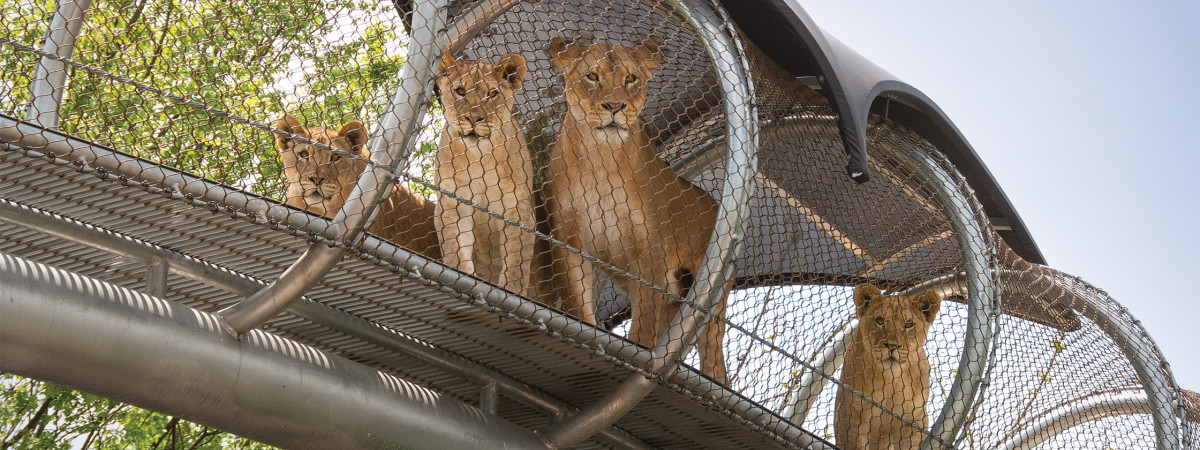 Afrikanische Löwenkinder in ihrem Big Cat Crossing Laufwegen.GiraffenfütterungGorilla Laufwege in den Baumwipfeln
