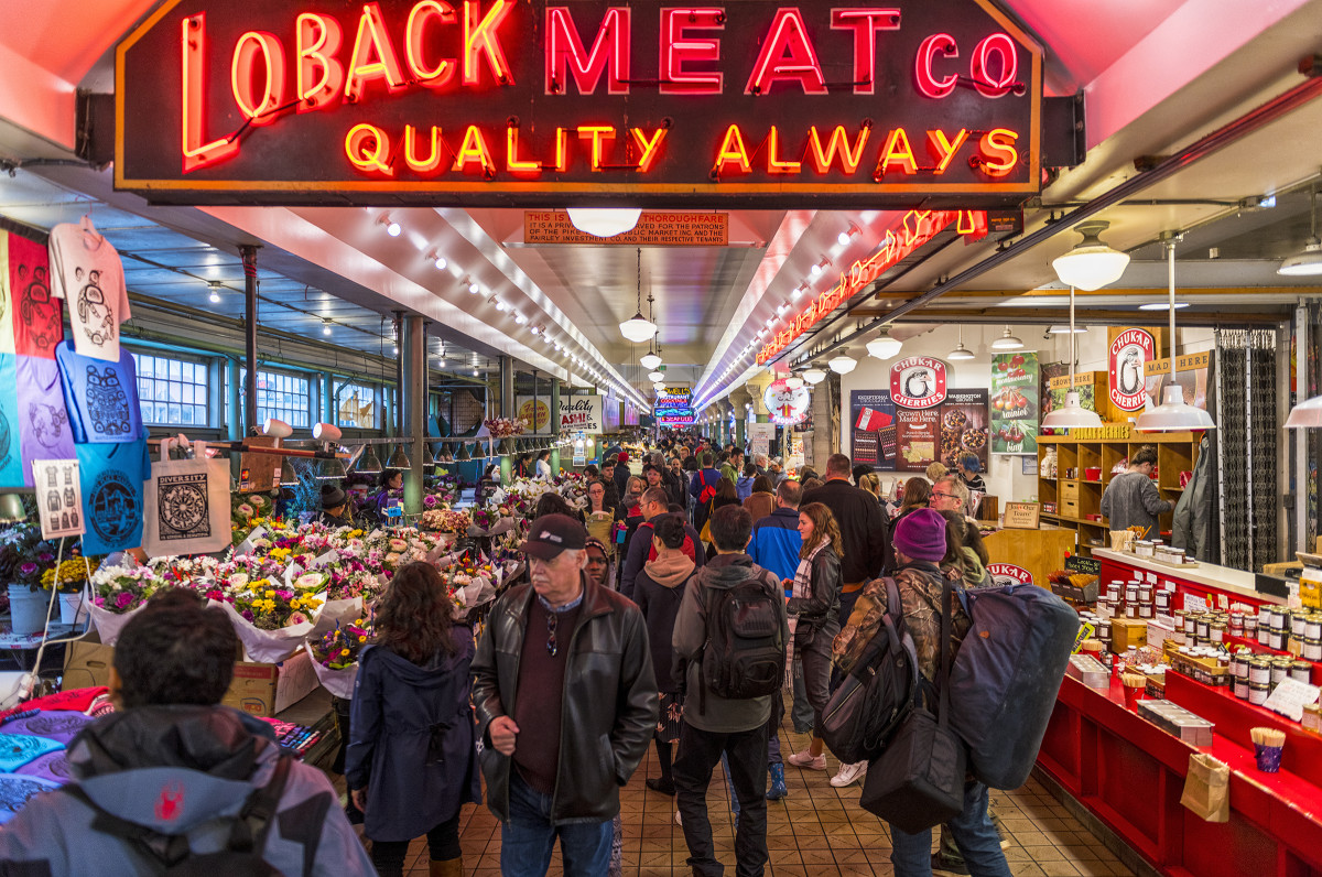 Einst 1907 eröffnet, ist der Pike Place Market seit über einem Jahrhundert fester Bestandteil Seattles und einer der ältesten Bauernmärkte der USA. Besucher können bei einem Spaziergang die bunte Vielfalt frischer Lebensmittel genießen, Fische fliegen sehen, einen bunten Strauß Blumen zusammenstellen oder Kunsthandwerk bestaunen. Wer möchte, kann sich in die Warteschlange vor der Ur-Starbucks-Filiale einreihen, sich mit Sparschwein Rachel fotografieren lassen oder einheimischen Musikern lauschen. Der Pike Place Market beherbergt auf seinen rund 36.500 Quadratmetern mittlerweile mehr als 500 kleine, unabhängige Läden.