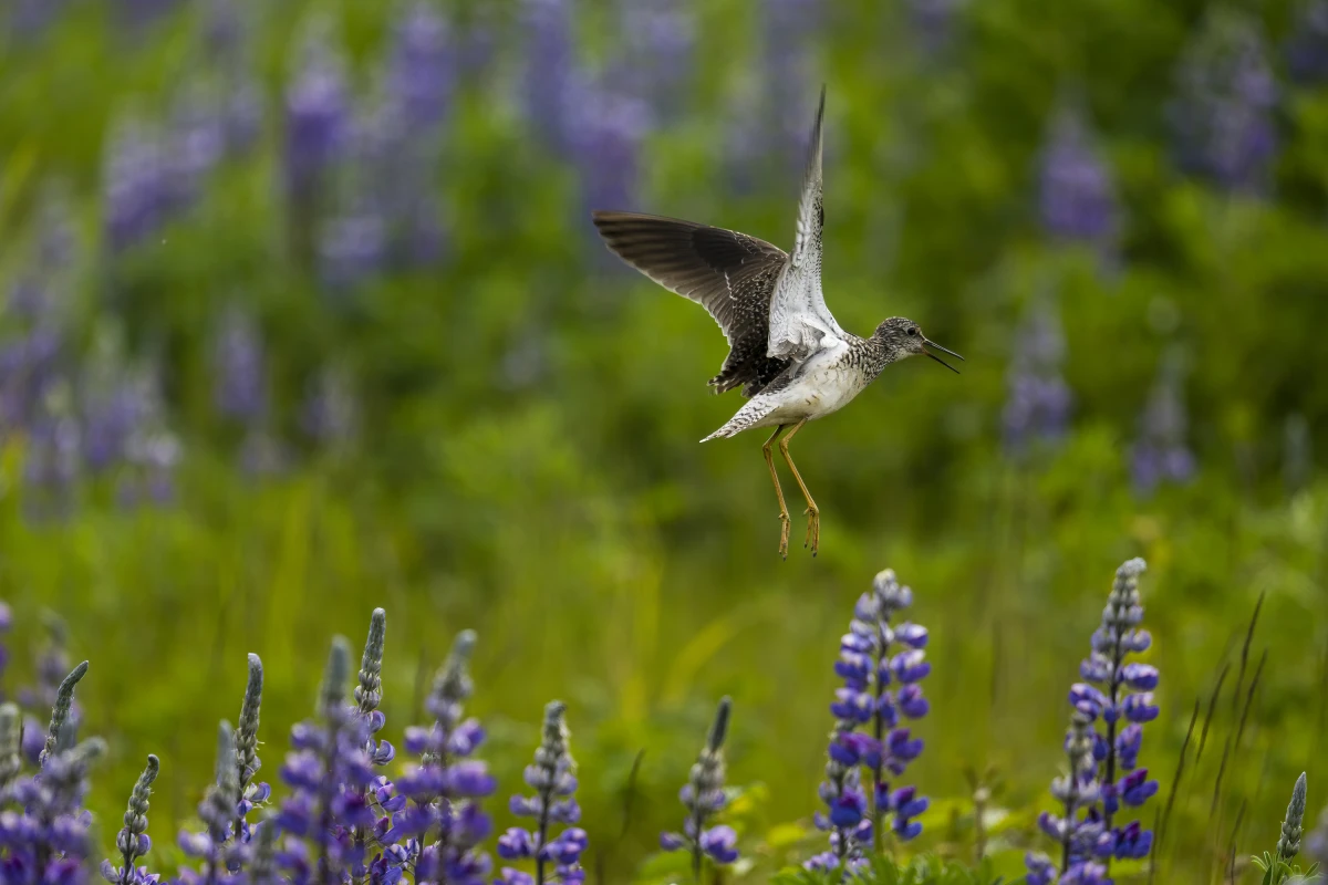 Greater yellowlegs (shorebird) flying over lupine | Carl Johnson / Visit Anchorage